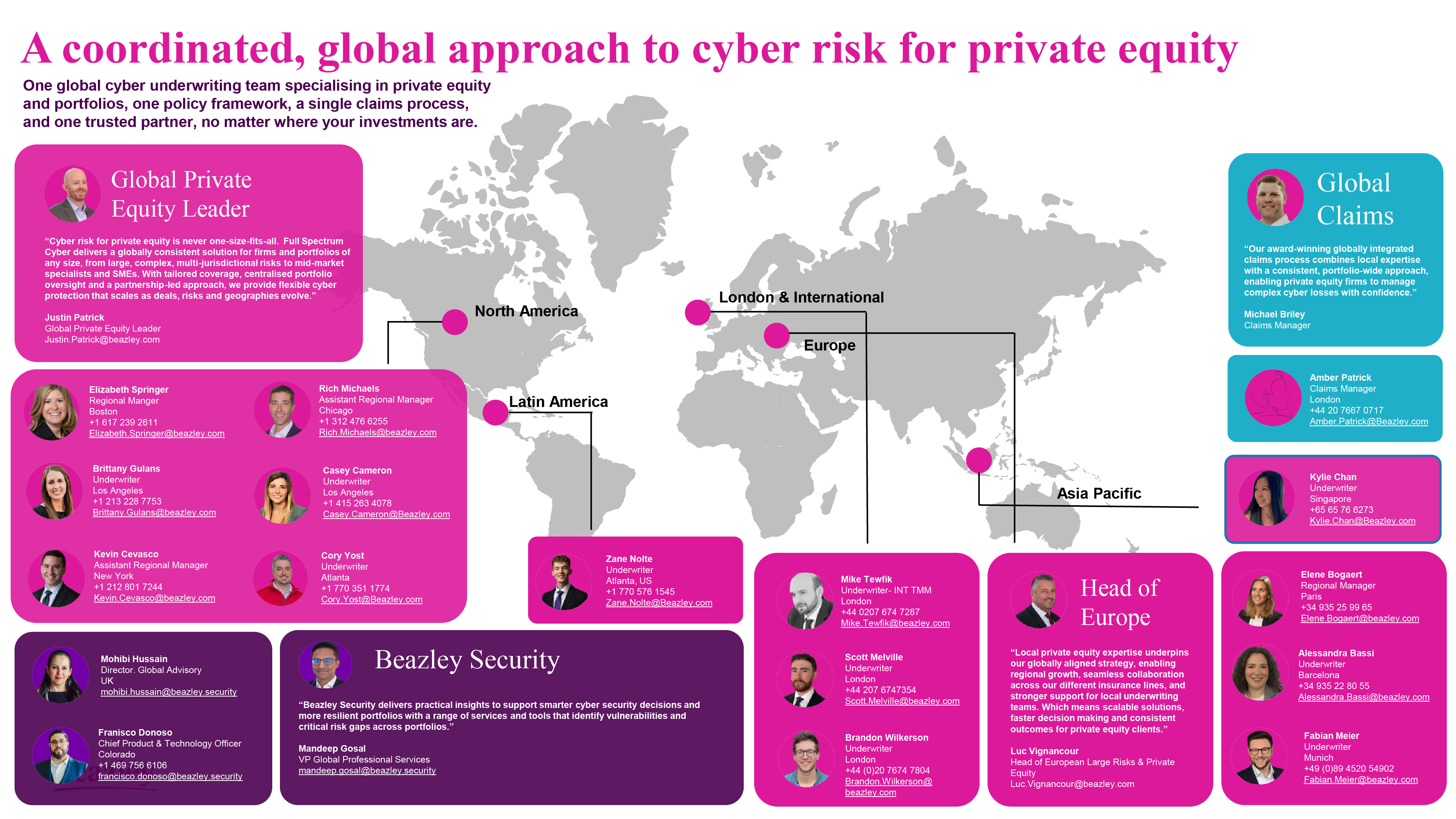 A coordinated approach to cyber risk anywhere in the world. One global cyber underwriting team specialising in private equity, one policy framework, a single claims process, and one trusted partner, no matter where your investments are.